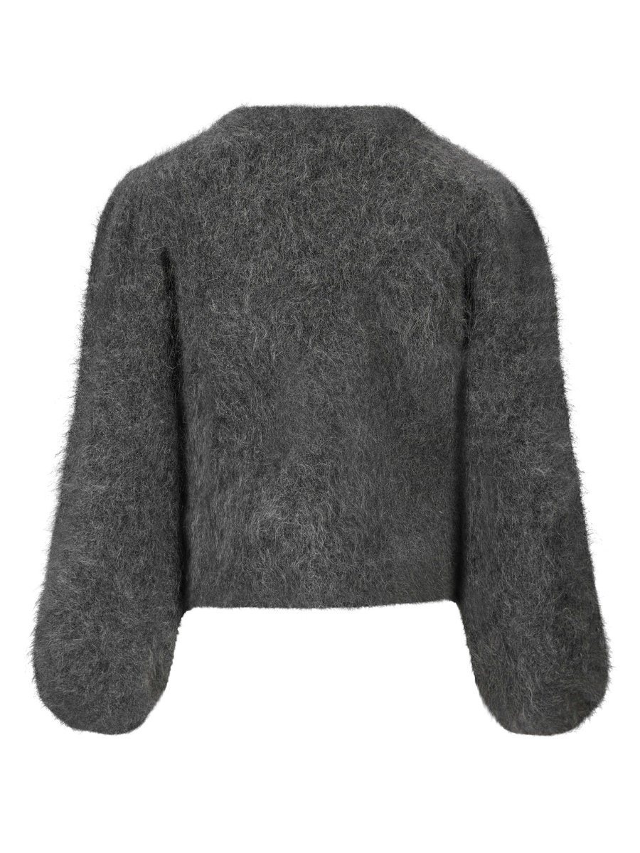Amelia is a thick a-shaped cardigan with a cropped fit. It has long sleeves with button closure at the front and fitted cuffs. The perfect cardigan for multiple occasions! 72% mohair, 26% nylon, 2% spandex