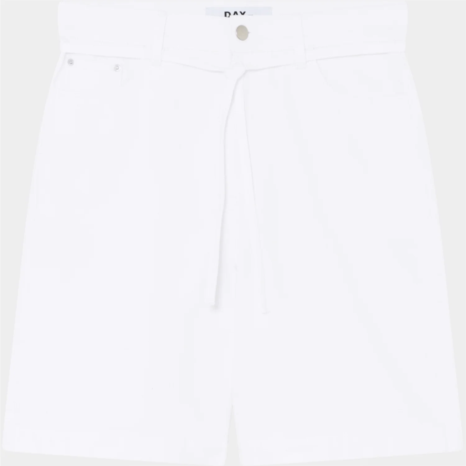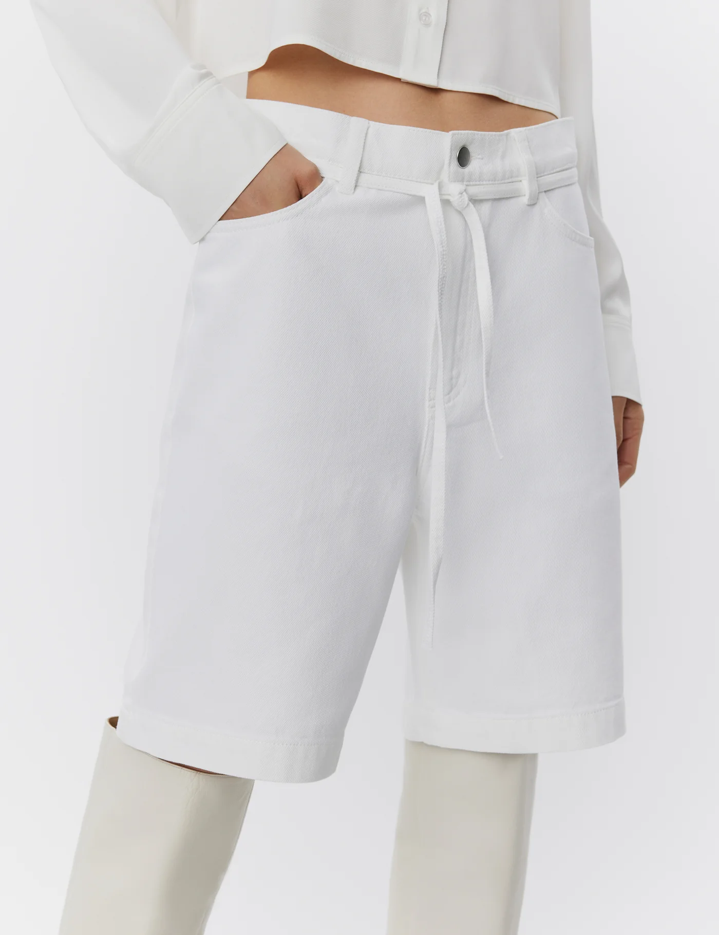 These Bermuda-style denim shorts feature five pockets, a zip fly with a button closure, and a removable tie belt at the waist. The shorts have a regular fit.