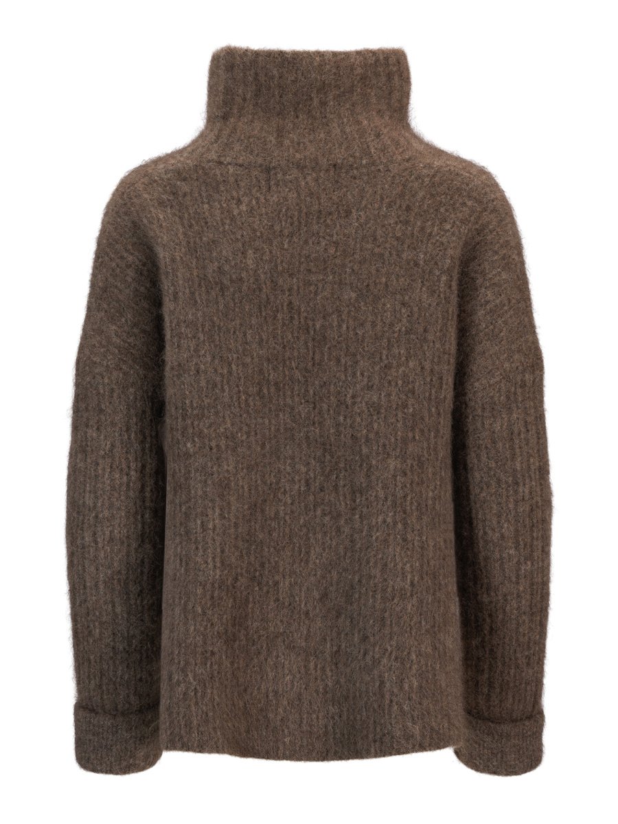 Emilie is an oversized chunky sweater with ribbed knit. The sweater features turtleneck,splits in side seam and long sleeves with a folded cuff. 72% mohair, 26% nylon, 2% spandex