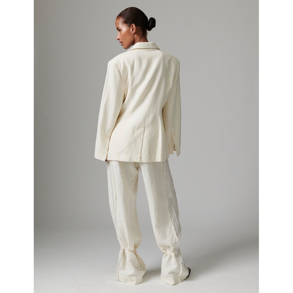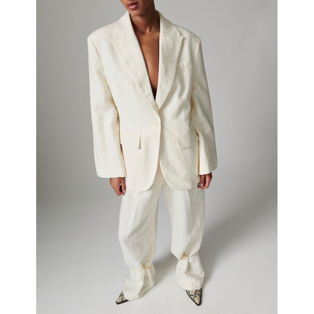 This classic linen blazer features padded shoulders, button closure, and pockets on the front. The blazer has a notched lapel and is fully lined. Pair it with matching linen trousers and a crisp button-down for a timelessly stylish look. 80%Viscose 17%polyamide 3%linen