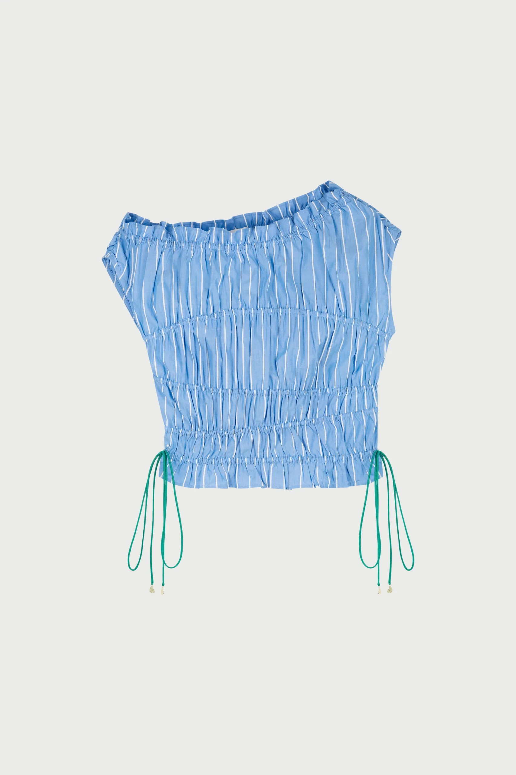 A sleeveless statement piece in blue with fine white stripes, designed in a fun, modern shape with an asymmetrical neckline. Green non-adjustable ribbon details at the side add a playful pop of color, while the regular fit keeps it easy and wearable. Made from 100% organic cotton, it feels light and breathable.