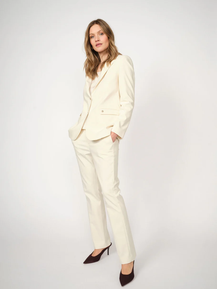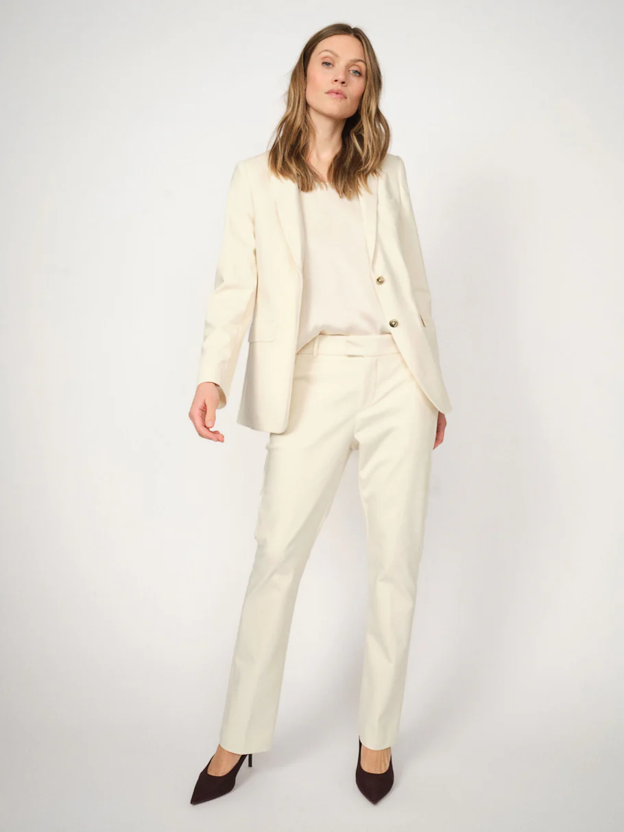 Disse klassiske, skreddersydde buksene er designet i en regular passform med middels høyt liv for en tidløs og flatterende silhuett. Den skjulte hektelukkingen og glidelåsen gir et rent uttrykk, mens den myke bomullsblandingen med organiske fibre tilbyr stretch og komfort. Kombiner med den matchende blazeren for et raffinert antrekk eller med en enkel strikk for uanstrengt eleganse.