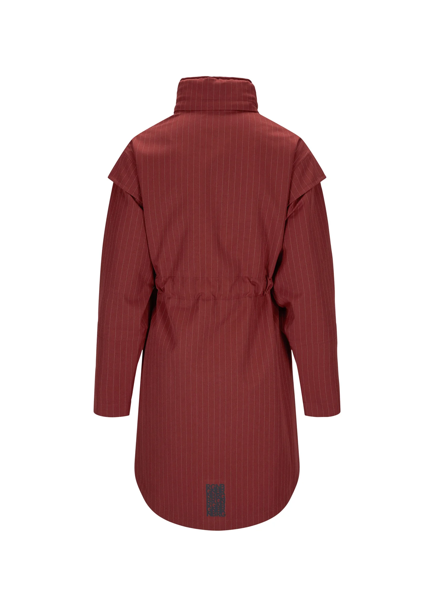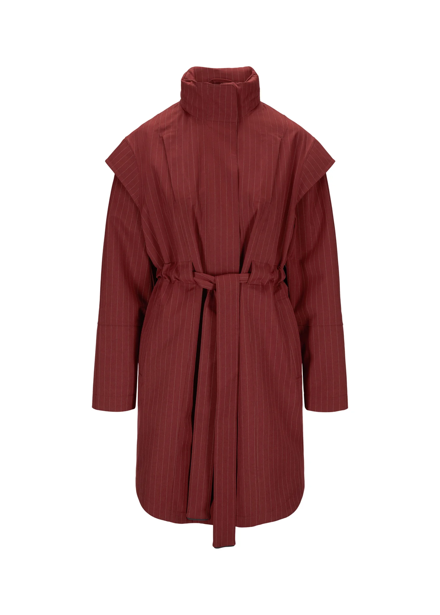 Monsun i Russet Pinstripe, er en vanntett regnjakke med fine detaljer som cap sleeves, belte i tunnel og skjult hette i kragen.