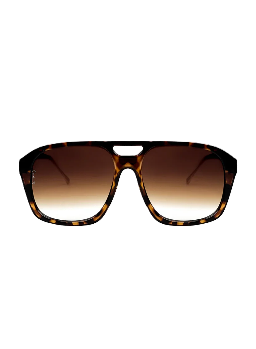 Reina fra Otra er en stilig statement-solbrille som gir et moderne løft til den klassiske aviator-stilen. Denne oversized modellen har en markant innfatning i tidløst skilpaddemønster med en trendy dobbelbro og elegante, gullfargede stenger i metall. De brune, graderte glassene sikrer et behagelig lys og gir full beskyttelse mot solen med kategori 3-linser. Solbrillen er det perfekte tilbehøret for å tilføre litt hverdagsluksus eller som en chic detalj på ferie.