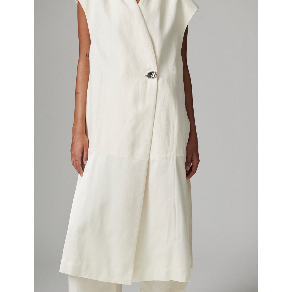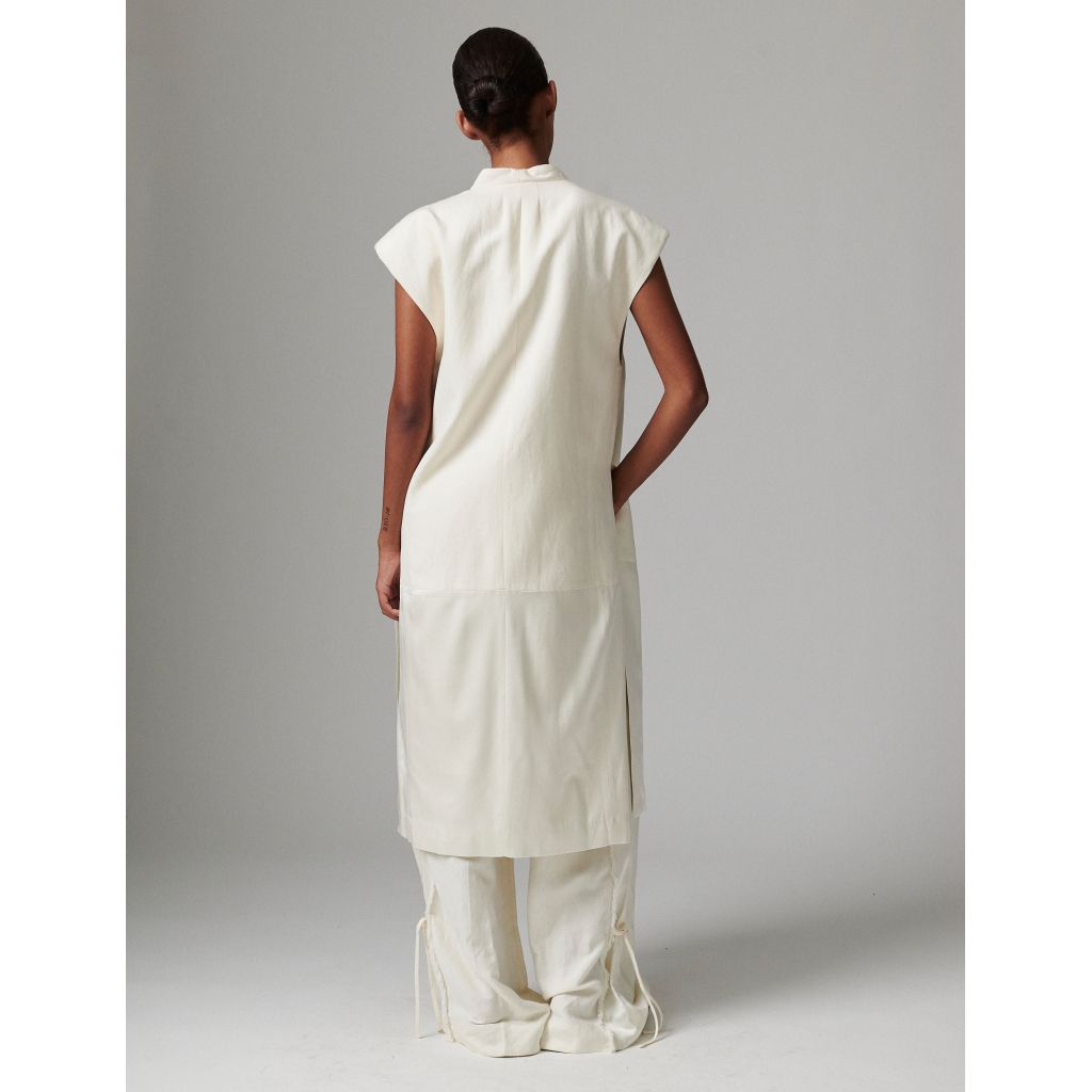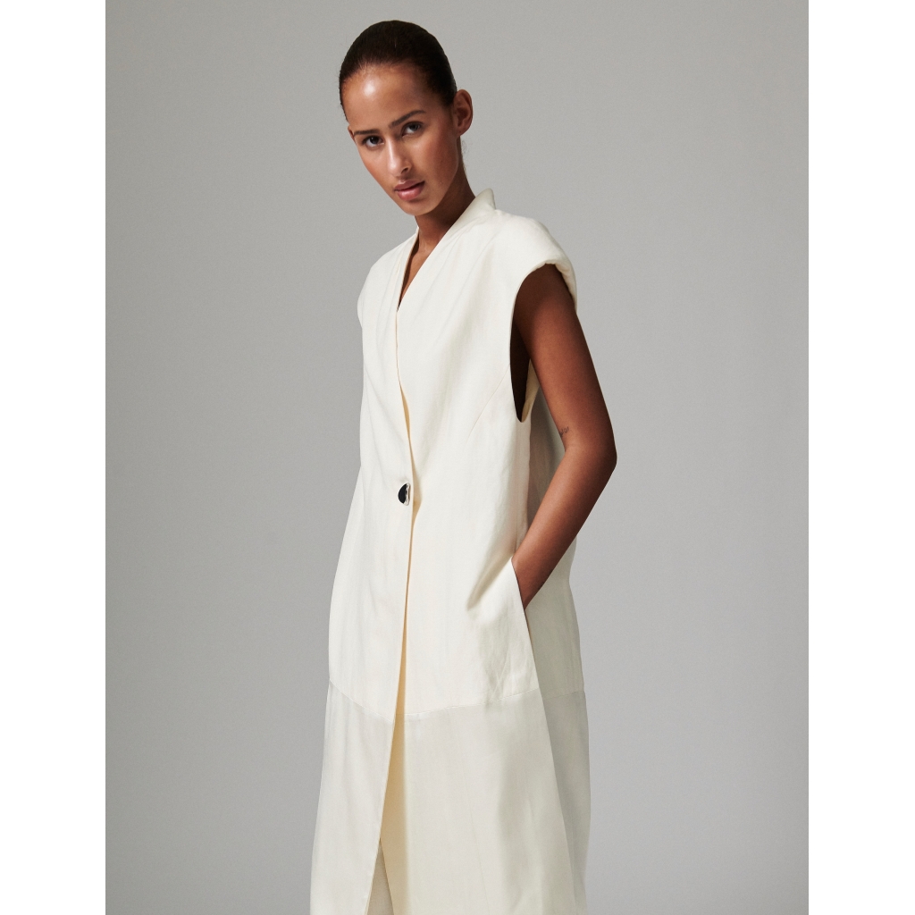 This longline, tailored waistcoat features a single button closure, strong shoulders, and a contrast panel from the thigh down to the hem. There are long slits on the sides. The sleek silhouette contrasted with the soft textures makes for an elegant look; add it on top of a loose, floaty dress for a sophisticated outfit. 80%Viscose 17%polyamide 3%linen