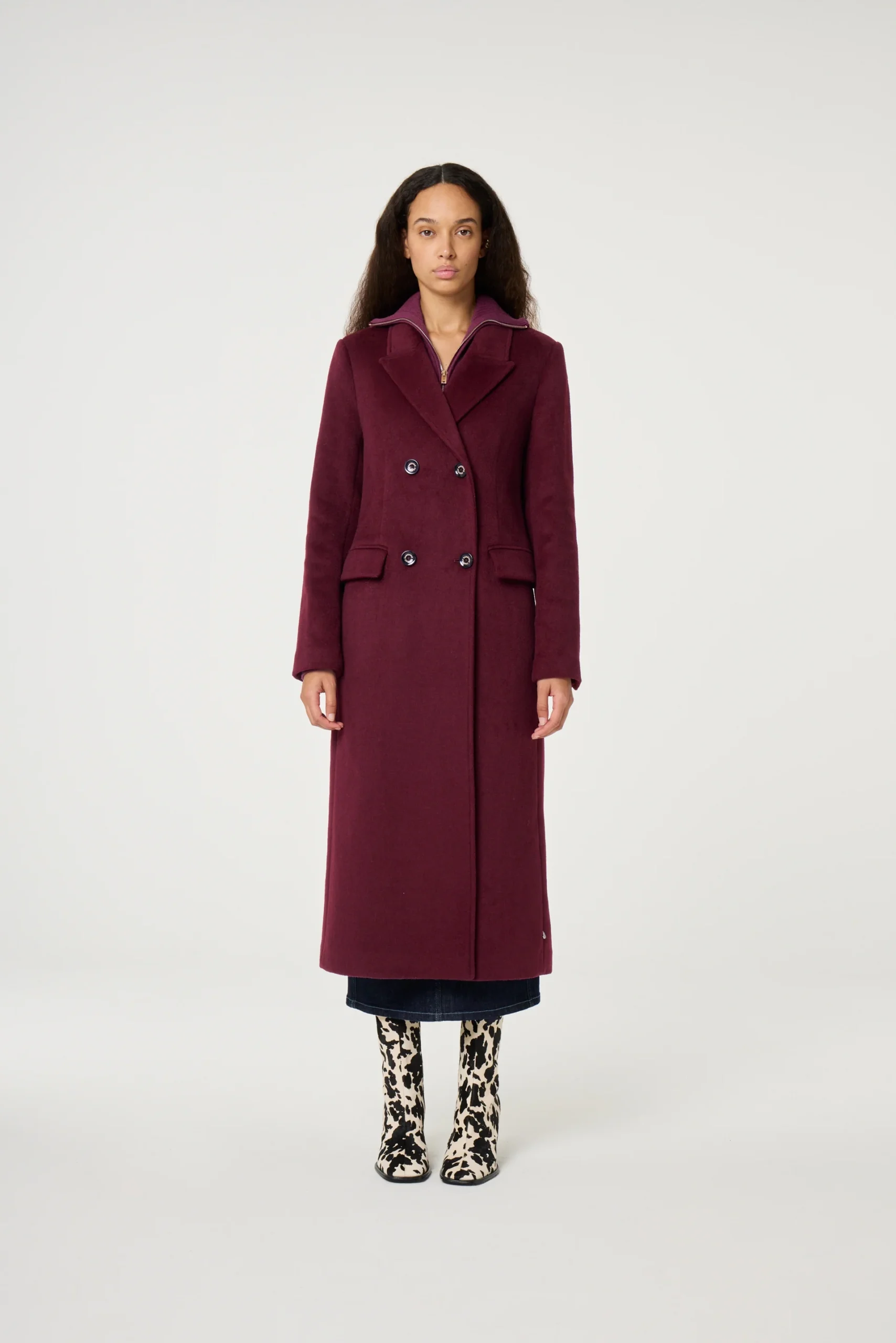 This long tailored maxi coat in deep burgundy is made from a warm wool blend, offering both comfort and structure. It features a sharp collar, four front buttons, and two side pockets for a clean, polished finish. A refined outer layer designed to elevate your cold-weather wardrobe.