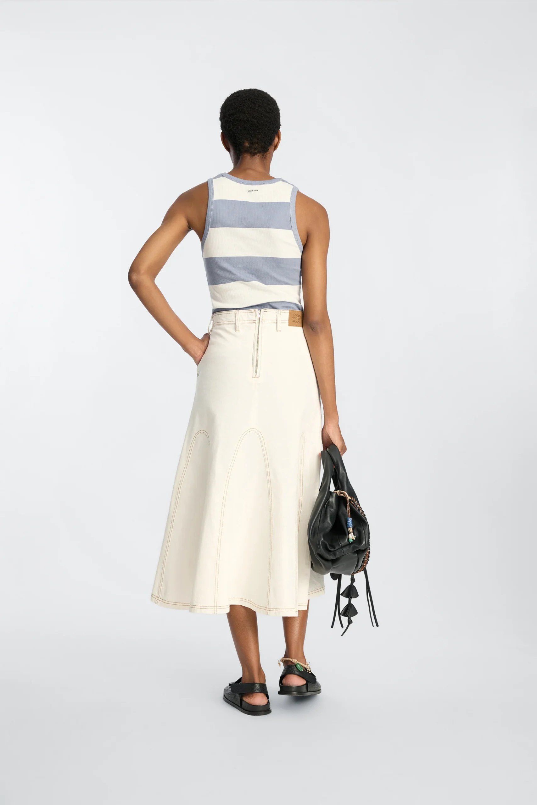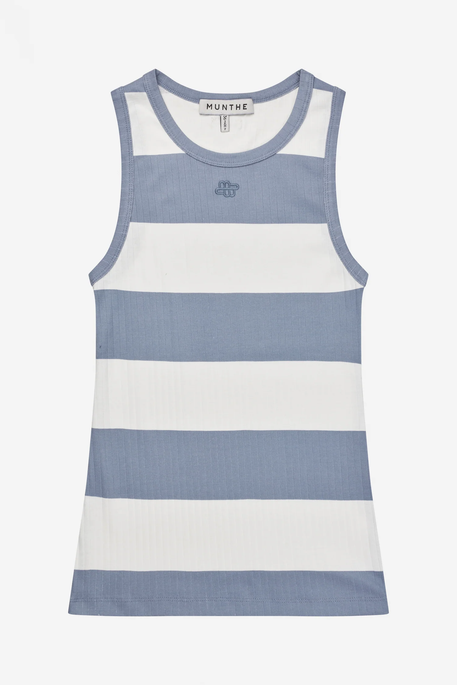 Ribbed tank top with strpes and a MUNTHE emblem embroidery on the chest. This tank top is designed for a close fit with a round neckline and is made of 100% organic cotton. The model is 176 cm and wears a size 36.