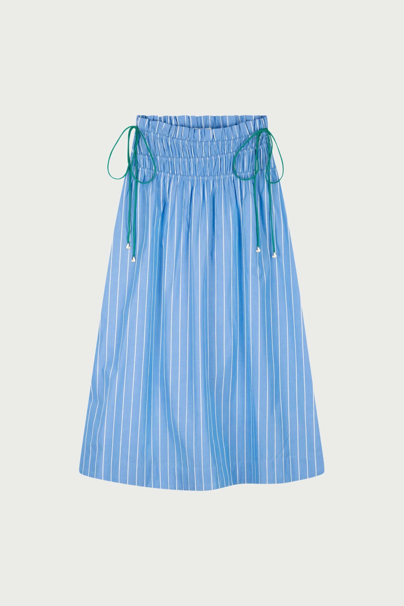 This blue and white striped skirt is crafted from 100% organic cotton for a soft, breathable feel. Designed with a regular fit, it features non-adjustable green ribbons on the sides, finished with delicate bead details for a playful touch. Perfect for sunny days or casual outings, and pairs effortlessly with the John top for a complete look. 100% Cotton (Organic)